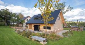 Místo, kde stojí tahle moderní roubenka, navigace ještě ani nezná. Jan na nás proto čeká na návsi, aby nám zbytek cesty ukázal osobně. Mineme poslední domy, kousek jedeme mezi poli, úzká silnička se d