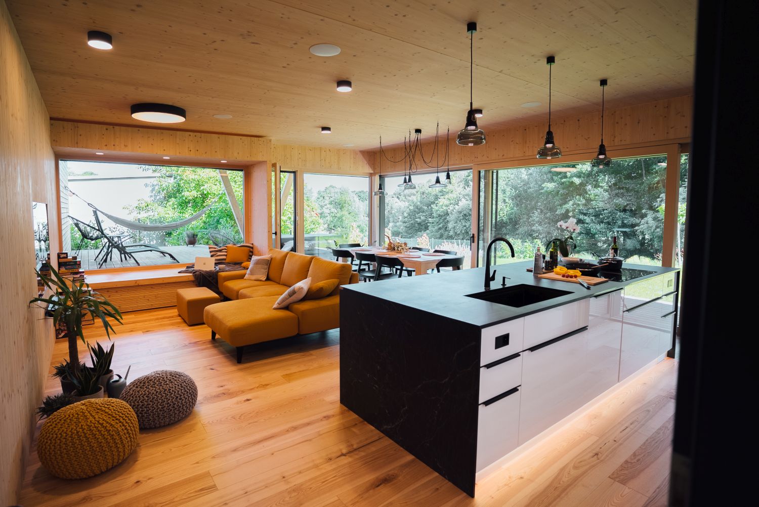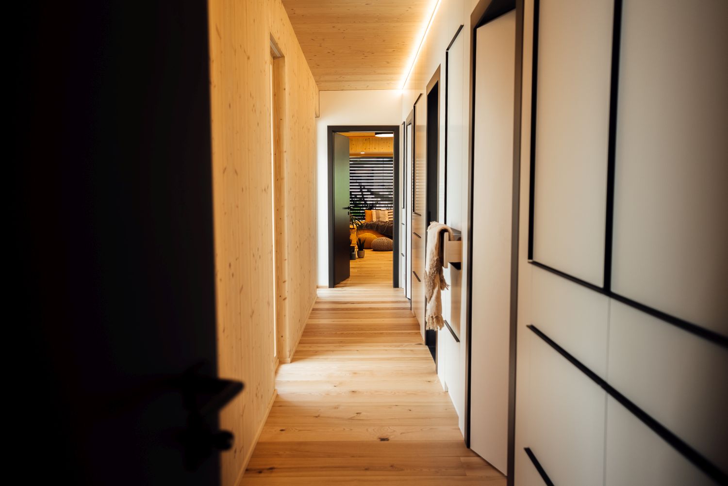 Dřevo jako konstrukční materiál – například zde použité masivní panely NOVATOP – přirozeně reguluje vnitřní klima, vytváří zdravé a klidné prostředí a už samotnou podstatou konstrukce podporuje filozofii slow living: bydlet jednoduše, poctivě a v souladu s přírodou.