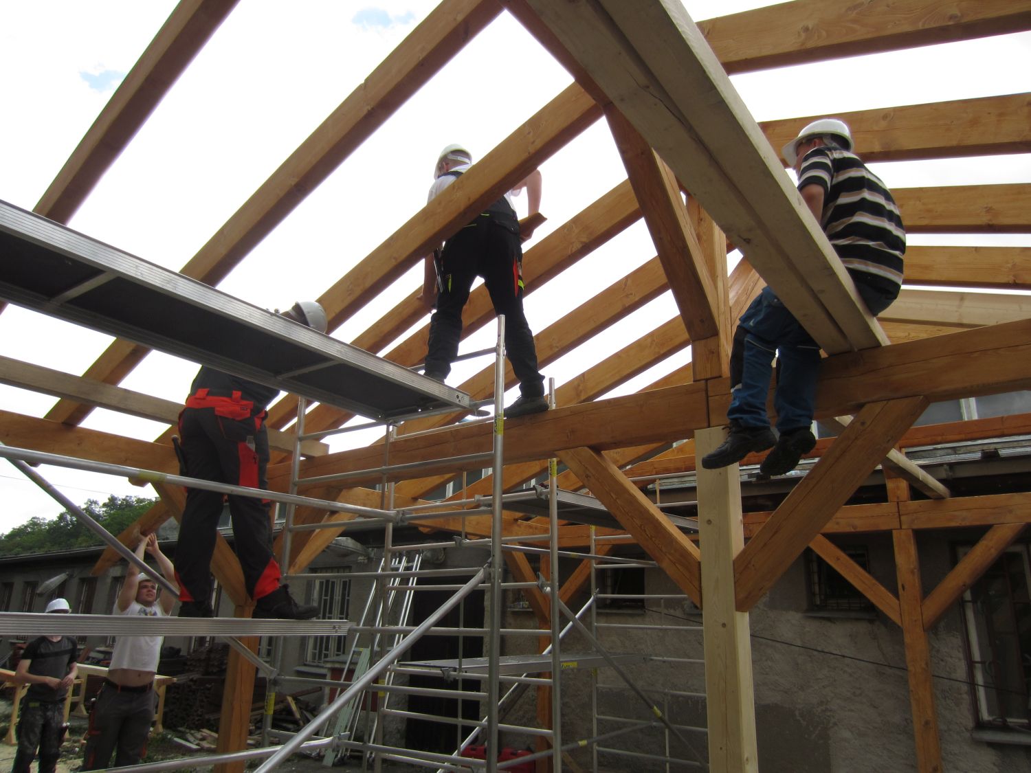 obr.: Od loňského roku skládají žáci oborů Tesař, Klempíř a Pokrývač závěrečné zkoušky na reálných zakázkách. Budoucí tesaři nejprve podle projektové dokumentace vyrobí dva altánové přístřešky, po nich klempíři provedou pokládku plechové krytiny a osadí klempířské prvky. A nakonec pokrývači na jednom z altánů provedou pokládku klasickou krytinou. Foto: ARCHIV ŠKOLY