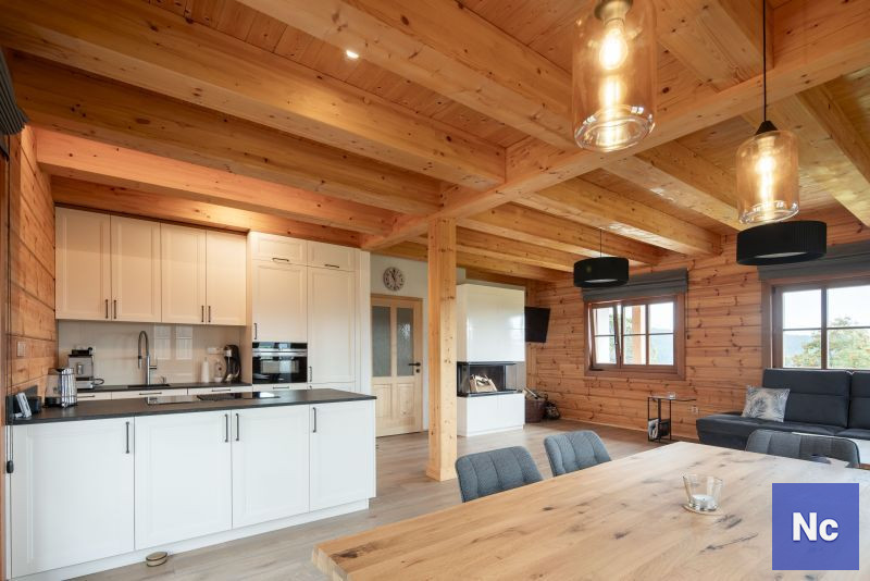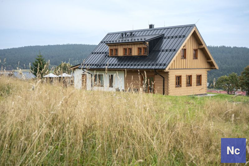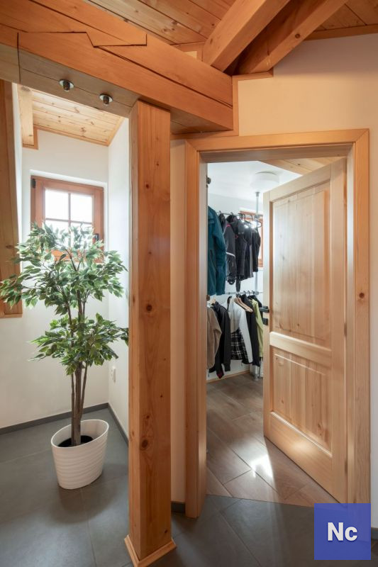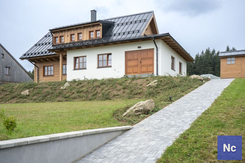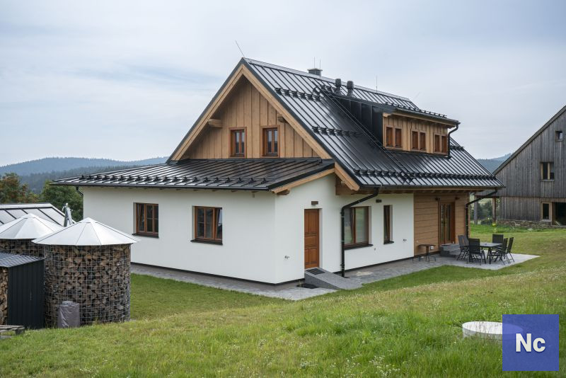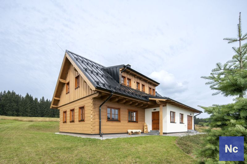 Konstrukční systém: obvodové masivní stěny z lepené finské borovice v kombinaci s obvodovými stěnami difuzně otevřeného systému NEMA EKO, vnitřní sendvičové příčky NEMA IN vč. nosných