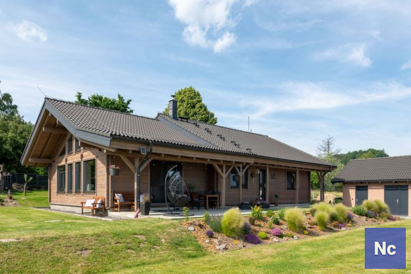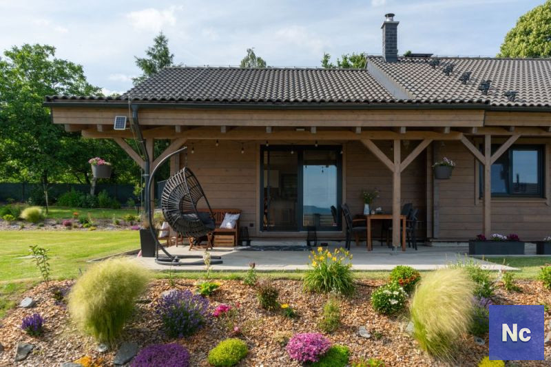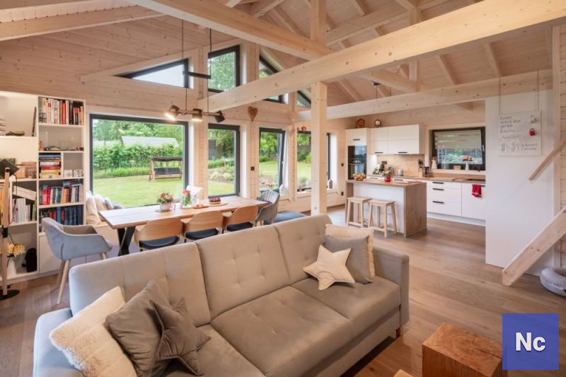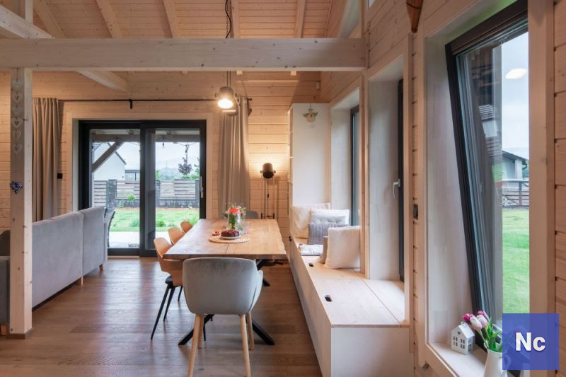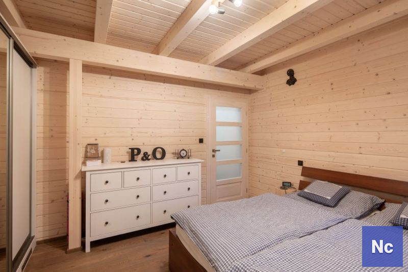 • Konstrukční systém: montovaná srubová stěna s nosným smrkovým lepeným hranolem, dřevěnými rošty s vloženou dřevovláknitou izolací a smrkovým obkladem zevnitř; koupelna a technická místnost zděné