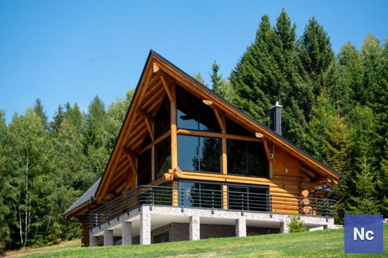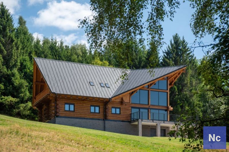 • Konstrukční systém: obvodové stěny: masivní smrková kulatina, suterén: betonové bednicí tvárnice tl. 300 mm, přízemí: cihlové příčky, podkroví: dřevěné sendvičové zateplené příčky