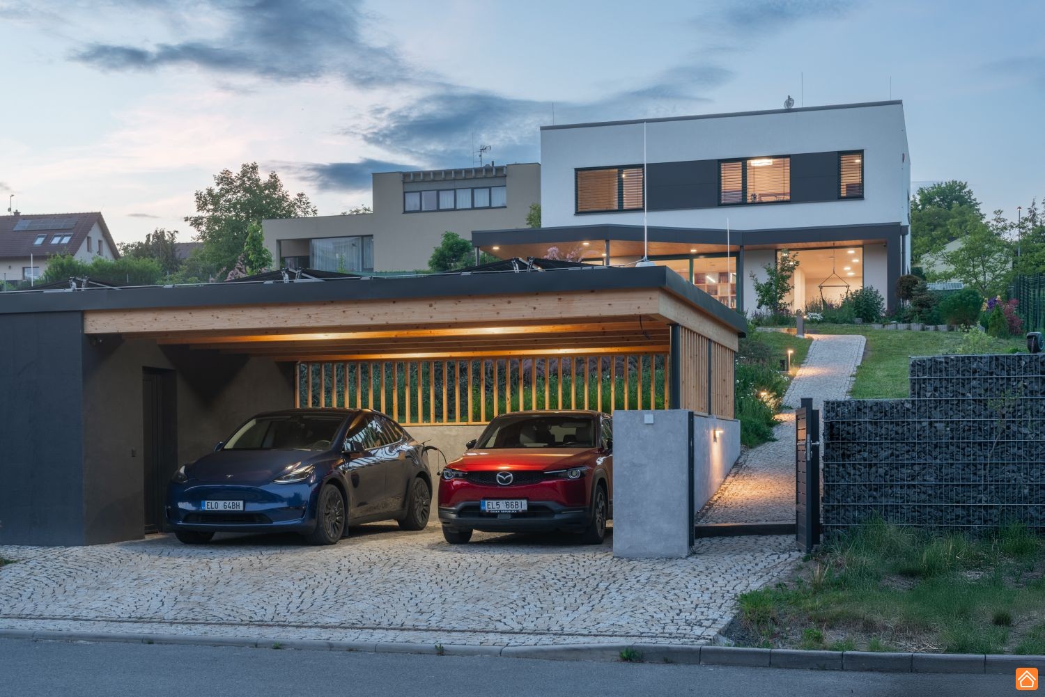 • Další vybavení: technologie s inteligentním řízením Loxone, FV systém na střeše carpotu 9,96 kWp + baterie