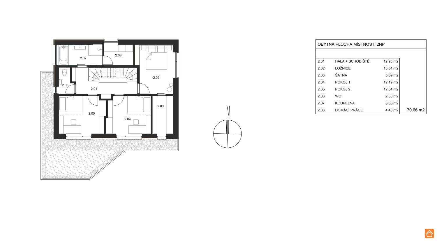 • Zastavěná plocha: RD – 91 m2, krytá terasa – 33,3 m2, carport se skladem – 67 m2
