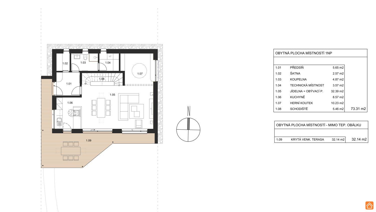 • Užitná plocha: RD – 145,6 m2, krytá terasa – 33,3 m2, carport se skladem – 59,5 m2