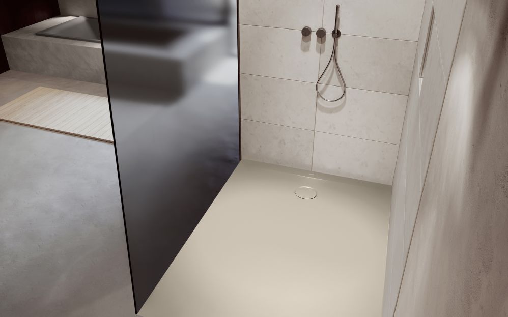 Kaldewei Calima se vyznačuje čistým, minimalistickým designem: Přechody bez prahů s neviditelnou hranou proti vytékání vody na třech stranách a přesné poloměry rohů vytvářejí elegantní vzhled v úrovni podlahy. Odtok se nachází na krátké straně mimo plochu pro stání a jeho okraj je ohraničen designovou hranou. Ta není jen vizuálním prvkem, ale zajišťuje také bezpečné odtékání vody.