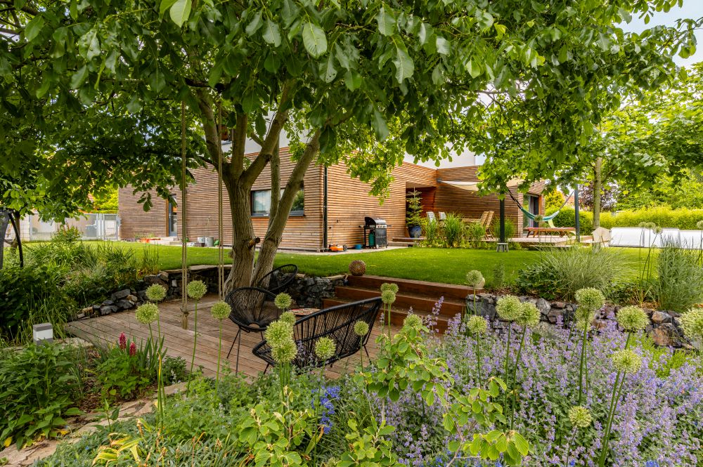 Na zalévání používá zachycenou dešťovku z podzemní nádrže nebo vodu z vrtu. Tu z vodovodního řadu používají jen na běžné potřeby uvnitř domu a do bazénu, protože na to je místní voda příliš železitá. V těsné blízkosti domu se vedle terasy rozkládá úctyhodný ořešák, který bylo letos potřeba prořezat, protože jeho větvě stínily fotovoltaice. V době stavby byl naštěstí ještě mladý a usazení domu tak nepřekážel, jen při přípravě spodní stavby narazili na jeho kořeny.