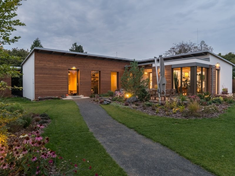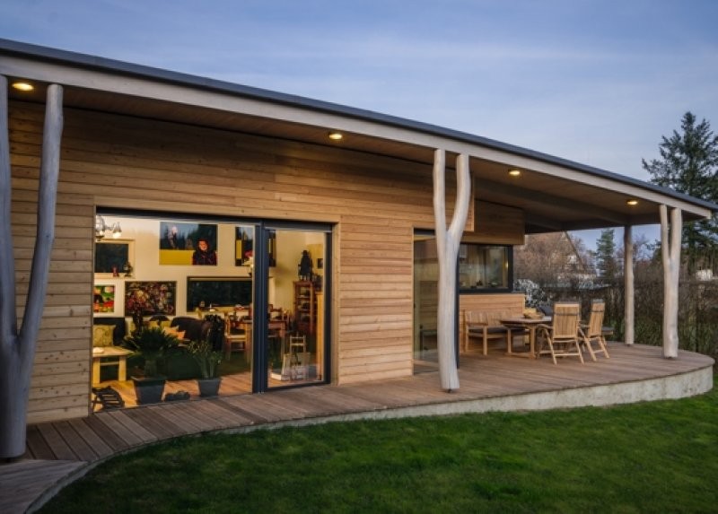 Maximální množství přírodních materiálů, zelené střechy, zaoblené tvary, splynutí se zahradou, návrh domu využívající tradiční čínské umění feng-shui, které se zabývá životem a harmonií s okolním pros