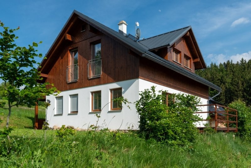 „... a za značkou se začátkem obce hned točte doprava – to poznáte, jsou tam jen novostavby, naše je ta obložená dřevem," vysvětluje mi Jirka. Nahradil moji navigaci, která mě prachsprostě nechala ke
