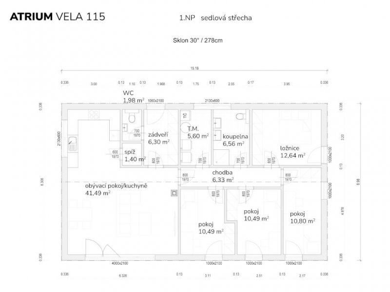 Moderní bungalov Vela 115 se stal téměř přes noc jedním z nejžádanějších domů kolekce firmy ATRIUM. Jednoduchá dispozice nabízí příjemné bydlení rodině se dvěma dětmi. Je tvořen dvěma dětskými pokoji a ložnicí se šatnou. Domácí atmosféru vytvoří krbová kamna, která bez problémů vytopí celý dům. Obdivné pohledy si vyslouží volba dřevěného obkladu, který dodá stavbě dokonalý vzhled a eleganci.
