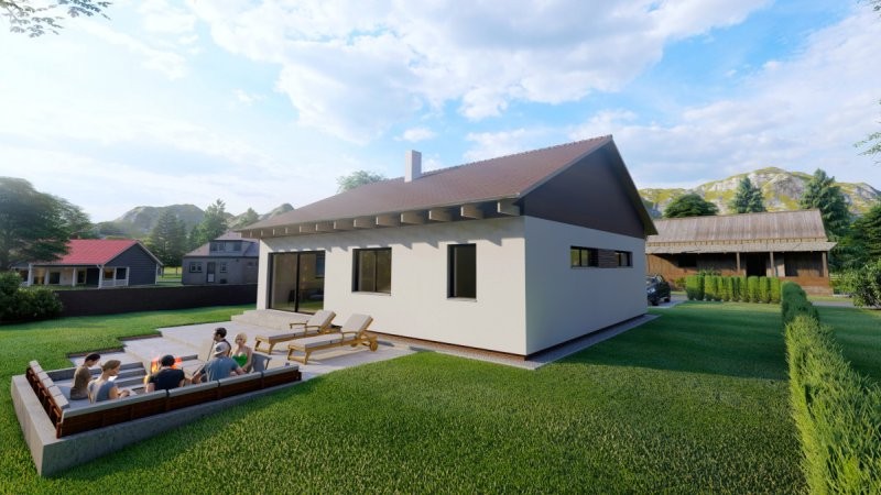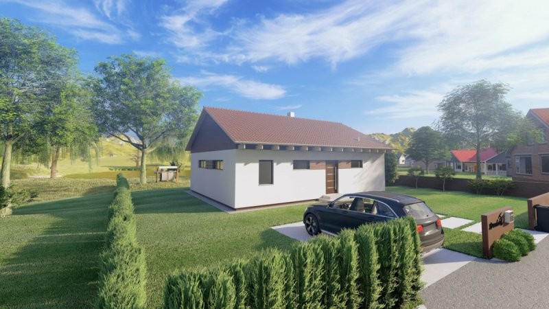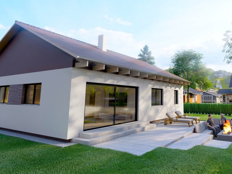 Tato dřevostavba je vlajkovou lodí z typové řady našich přízemních domů. Pozemek na něj by měl být spíše rovinatý. Pro ty, kteří chodí neradi do schodů, nabízí zajímavé, pohodlné a prostorné bydleni. A pokud by to bez schodů přece jen nešlo, lze v podkroví dřevostavby zřídit velký úložný prostor.