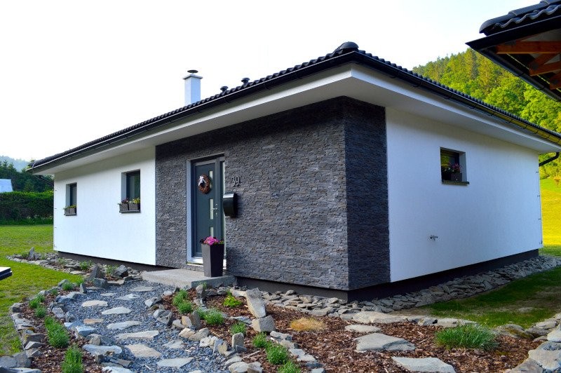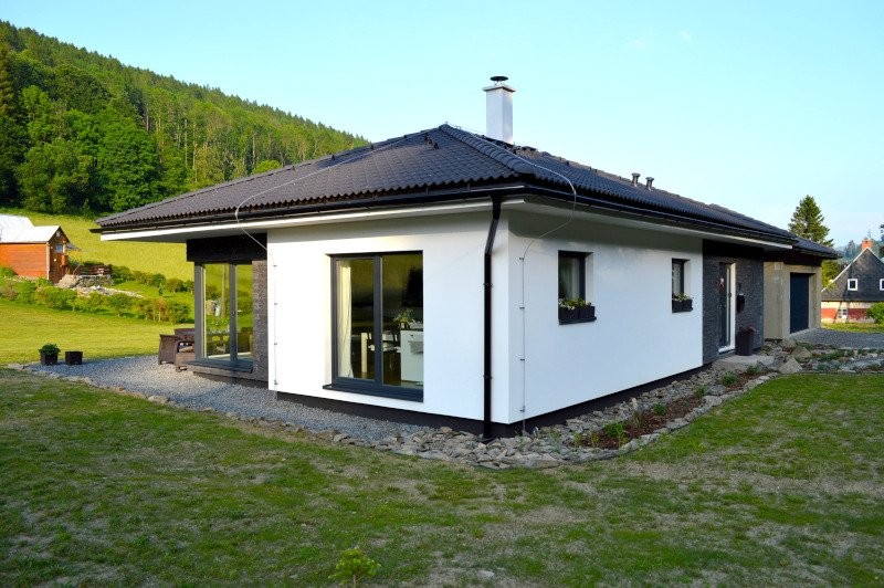 Krásný moderní bungalov s valbovou střechou, částečně krytou terasou a francouzským oknem do Vaší zahrady.