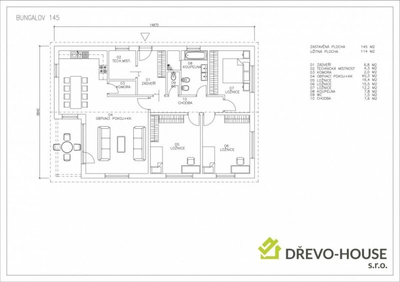 Nejpopulárnější bungalov 145, je navržen s maximálními úložnými prostory. Dispozičně je navržen jako 4+KK. S velkým obývacím pokojem a krytou terasou, kde můžete trávit příjemné chvíle s rodinou i v období deště. Tento dům nabízí komfortní bydlení pro 4 člennou rodinu. Dům může být i bezbariérový.
