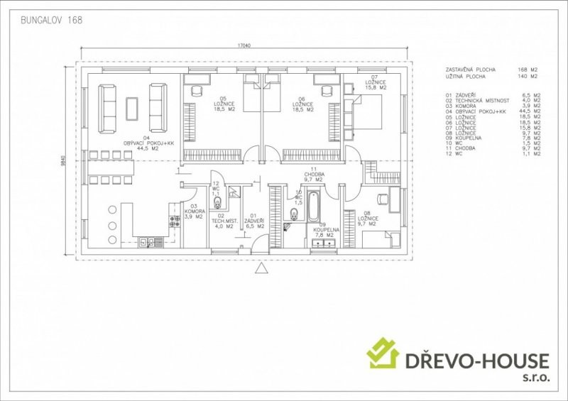 Nízkoenergetický bungalov 168, je navržen, jako prostorný dům pro pěti člennou rodinu s velkými pokoji a dominantním obývacím pokojem propojeným s terasou. Dispozičně je navržen, jako 5+KK. Má prakticky vyřešenou dispozici s úložnými prostory a dvěma záchody. Může být proveden i jako bezbariérový.