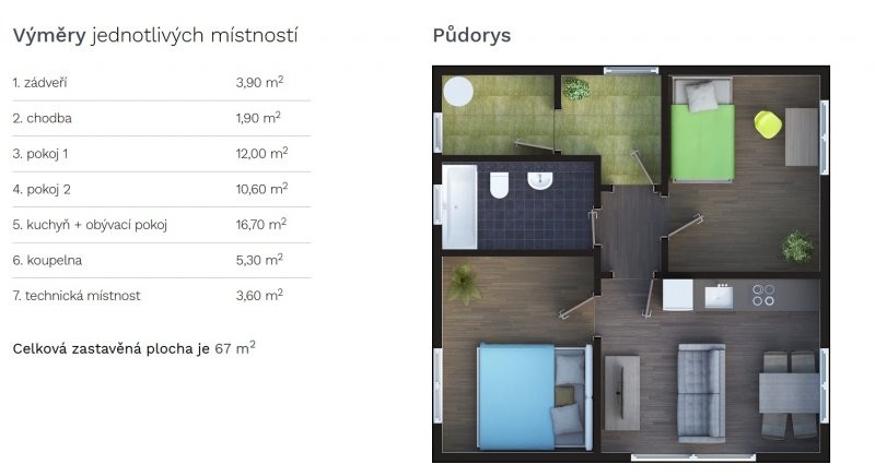 - Promyšlená dispozice domu. Dům je koncipován jako 3+kk tak, aby vyhoval všem věkovým kategoriím.