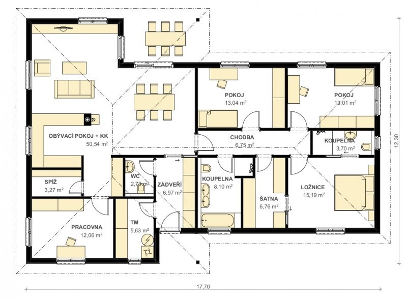 Typový bungalov XL 04 nabízí maximum prostoru pro Vaši rodinu i dostatek skladovacích prostor. Využít můžete prostornou šatnu, technickou místnost i spíž poblíž kuchyně. Velký obývací prostor se vstup na terasu je ideální pro rodinná setkání. Zároveň je samostatnou chodbou oddělena klidová část domu v pravé části. Prostornou pracovnu lze využít také jako pokoj pro hosty.