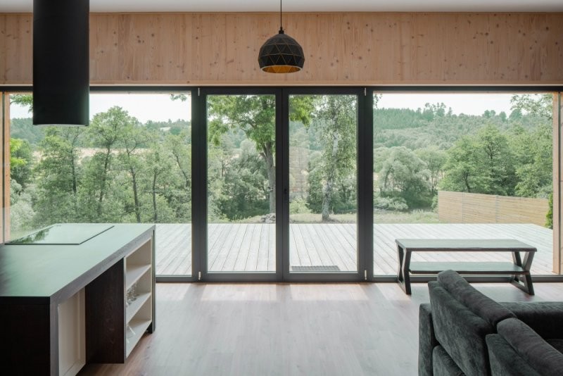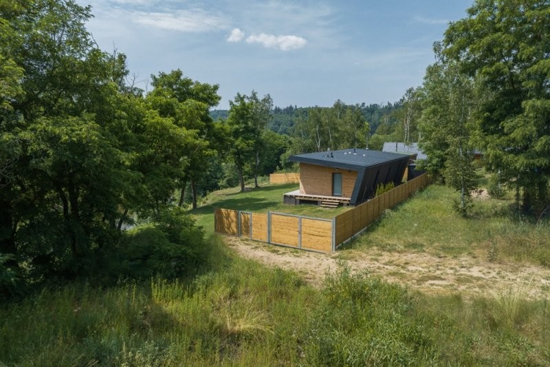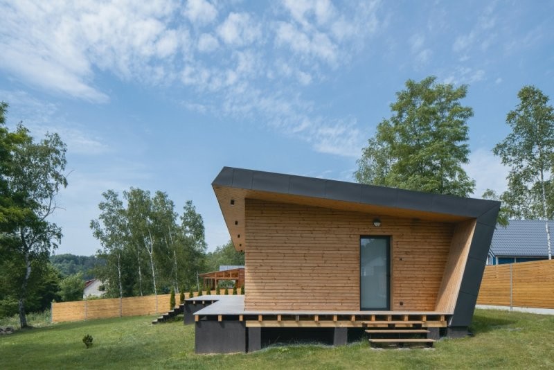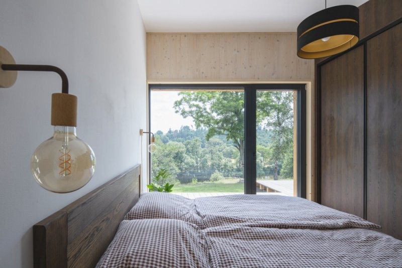 Rekreační objekt je přízemní. Při východní straně se nachází vstup do domu, tento je přístupný přes vyvýšenou terasu vzhledem ke zvolené konstrukci domu a úrovně +0,000. Dispozice dále sestává ze zádveří, technické místnosti, samostaného WC a koupelny, chodby ze které je vstup do pokoje a dále obývacího pokoje s jídelnou a kuchyní. Přes obývací pokoj lze dále pokračovat na venkovní terasu. Základní hmoty fasád tvoří horizontální dřevěný obklad