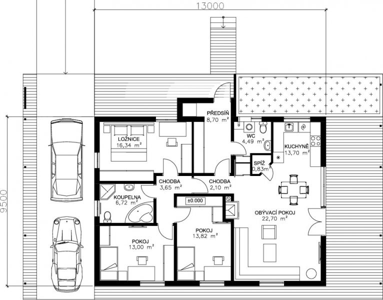 Nepodsklepený jednopodlažní rodinný domek velikostní kategorie 4+kk pro 4-5ti člennou rodinu. Dům je umístěn na rovinatém pozemku se vstupem ze severovýchodní strany. V této cenové kategorii poskytuje dům maximální komfort. Disponuje prostornou předsíní s úložným prostorem, velkou ložnicí s pracovnou, která se dá opticky oddělit od spací části. Intimní zóna ložnice a dětských pokojů je vhodně umístěna stranou od obytné části a lze ji uzavřít dveřmi na chodbě. Obývací prostor domu se otvírá na terasu a do zahrady na jihovýchodní straně. K domu je napojen parkovací přístřešek pro dva osobní automobily. Zastřešení stání probíhá i na přední fasádě a vytváří tak krytý vstupní prostor.