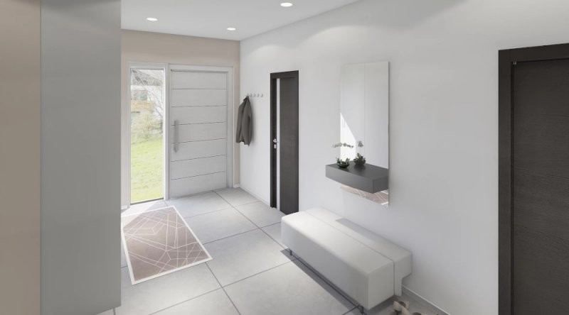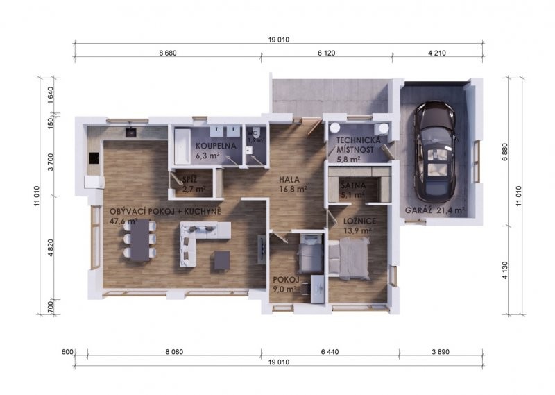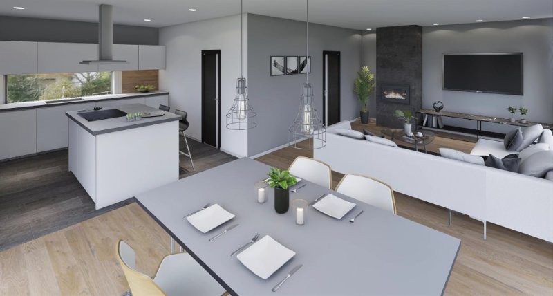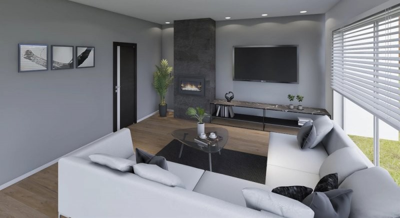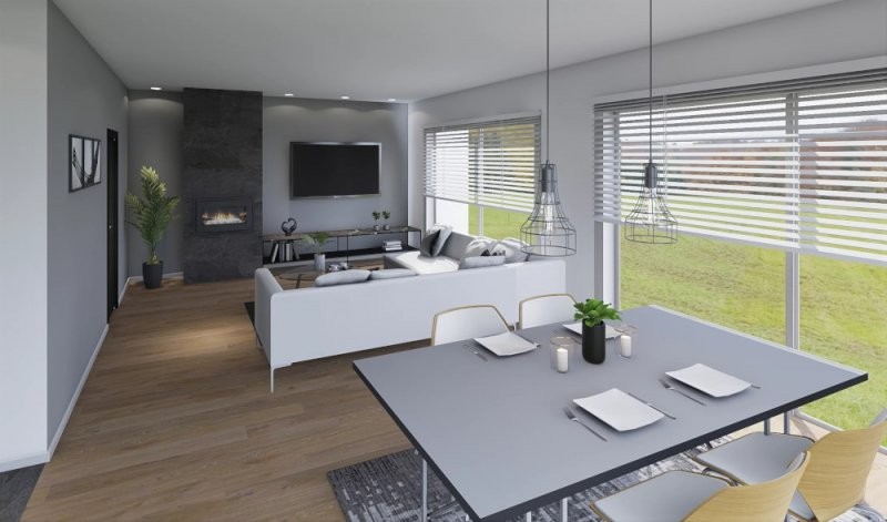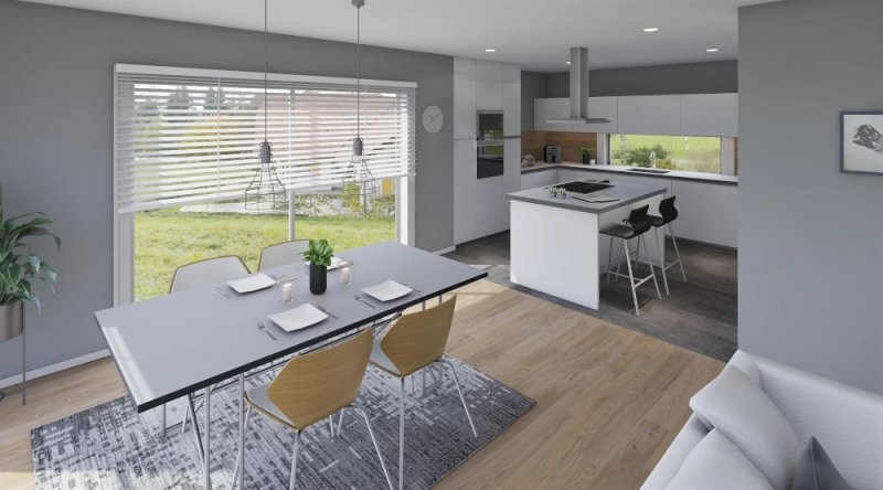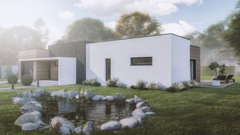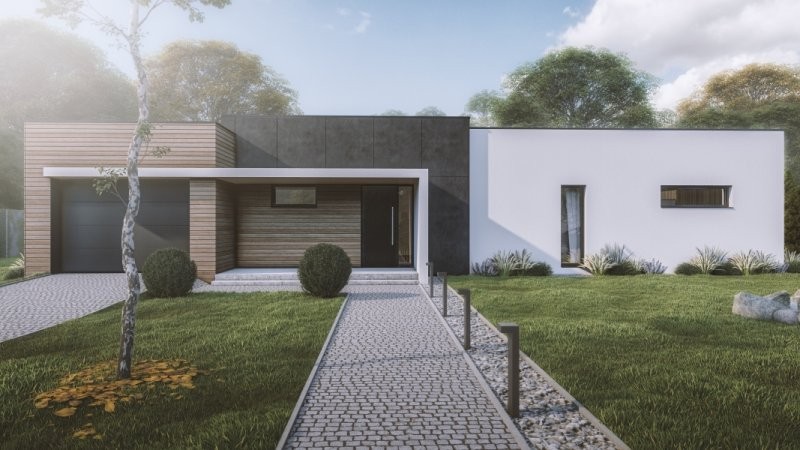 Moderní dřevostavba o dispozicích 3+KK+garáž nebo 4+KK. Z prostorné chodby je vstup do obývacího pokoje se vyznačuje velkou prosklenou plochou za využití francouzských oken s výstupem na terasu. Za zmínku stojí i ložnice, kde je prakticky navržena šatna. Pro vícečlennou rodinu je tato stavba naprosto ideální, jelikož lze garáž využít jako další místnost a pro svůj automobil vystavět kryté stání. Rodinný dům o této velikosti se již doporučuje založit na základové desce.