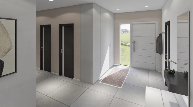 Dispozice: Objekt má jedno nadzemní podlaží s jednou jednotkou 3+kk – vstup + chodba, kuchyně, obývací pokoj, spíž, ložnice, pokoj, koupelna, wc a technická místnost + garáž či pokoj.