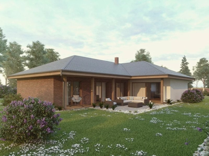 K domu lze navrhnout terasu až o velikosti 60 m2, kdy na ni téměř ze všech místností vede francouzské okno.