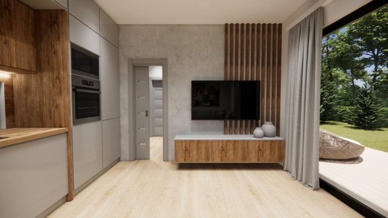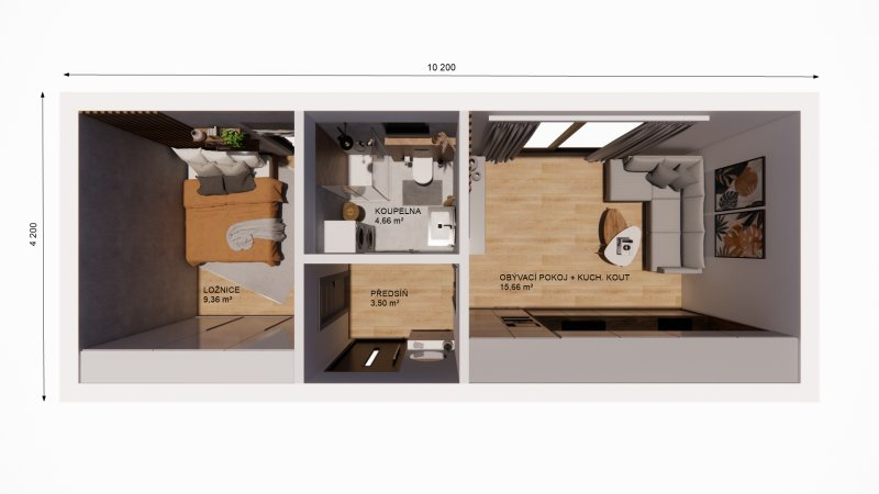 Dispozice: Objekt má jedno nadzemní podlaží s jednou jednotkou 2+kk – vstup, obývací pokoj s kuchyňským koutem, koupelna a pokoj.