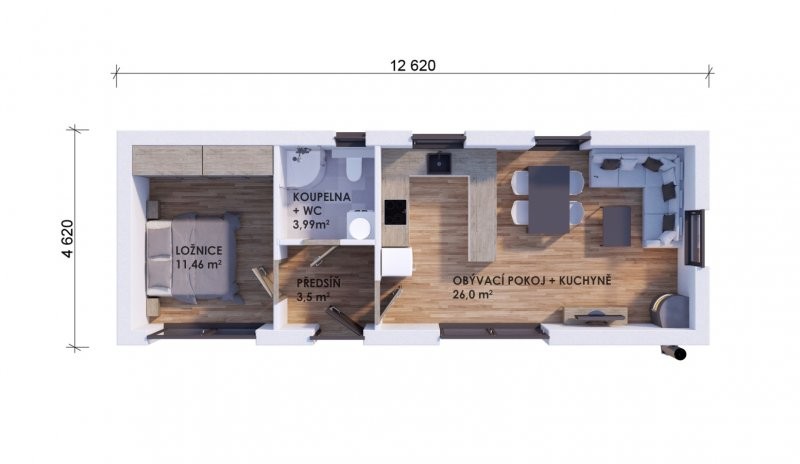 Dispozice: Objekt má jedno nadzemní podlaží s jednou jednotkou 2+kk – vstup, obývací pokoj s kuchyňským koutem, koupelnou a ložnicí.