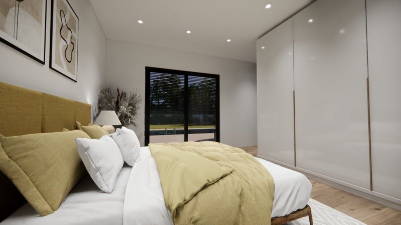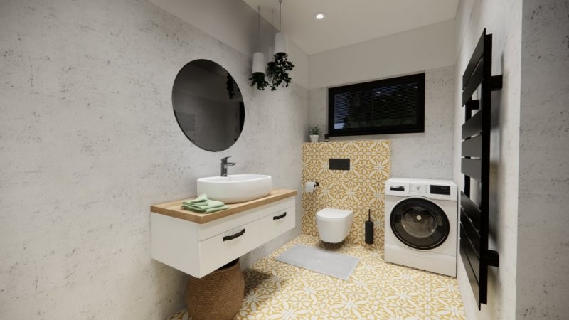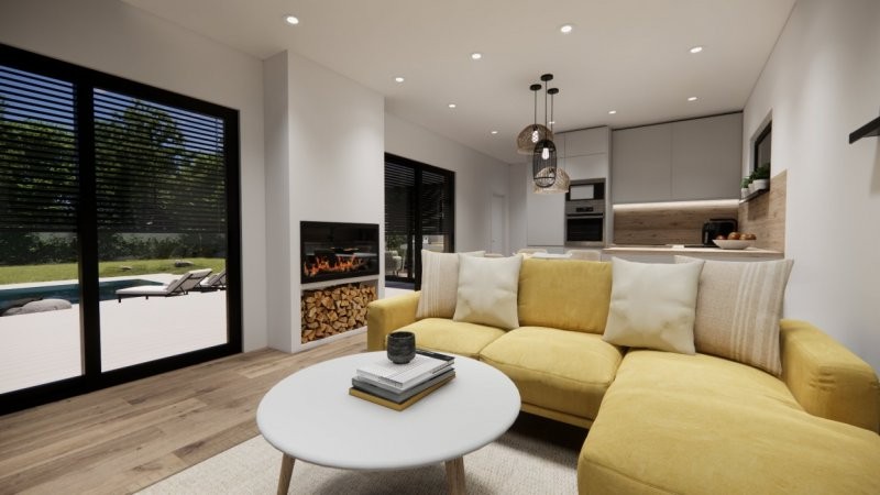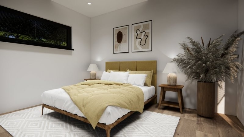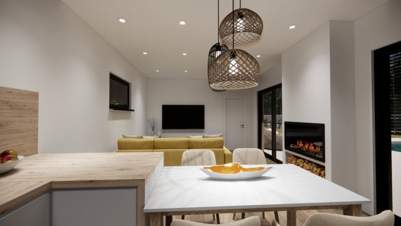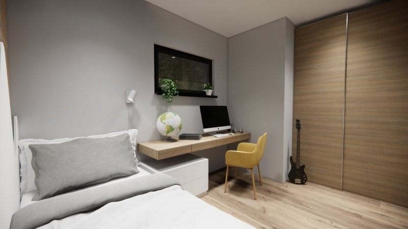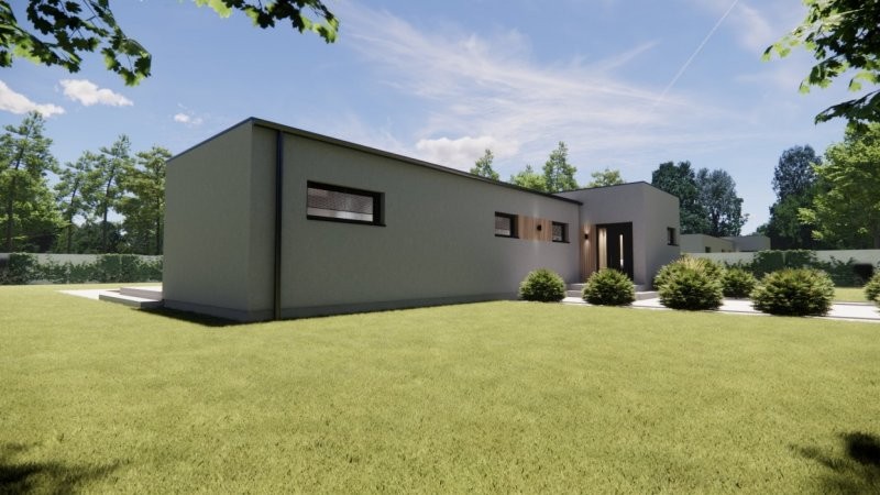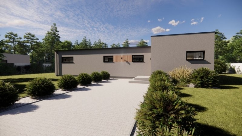 Moderní dřevostavba s půdorysem do tvaru T může být vystavěna přímo v místě pozemku zákazníka či v případě pozemku vhodného pro usazení modulů může být prefabrikována v naší výrobní hale a kompletována na místě. Nízké pořizovací náklady a rychlost výstavby (do 3 měsíců) jsou další výhodou. Dispozice domu 3+kk s prostorným obývacím pokojem a kuchyní splňuje kritéria plnohodnotného bydlení běžné rodiny. Střecha u tohoto domu může být sedlová či rovná.