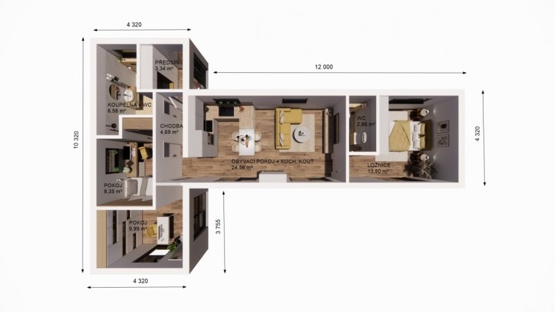 Dispozice: Objekt má jedno nadzemní podlaží s jednou jednotkou 3+kk – vstup, chodba, obývací pokoj s kuchyňským koutem, koupelna, ložnice, pokoj se šatnou, komora.