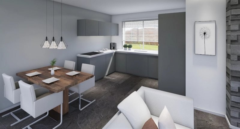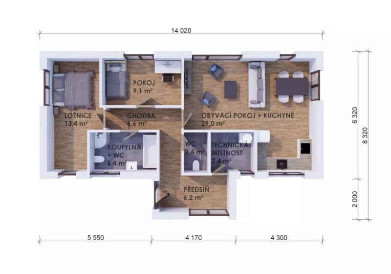 Dispozice: Objekt má jedno nadzemní podlaží s jednou jednotkou 3+kk – vstup se zádveřím as chodbou, obývací pokoj s kuchyňským koutem, koupelna, technická místnost, pokoj a ložnice.