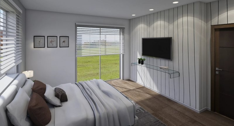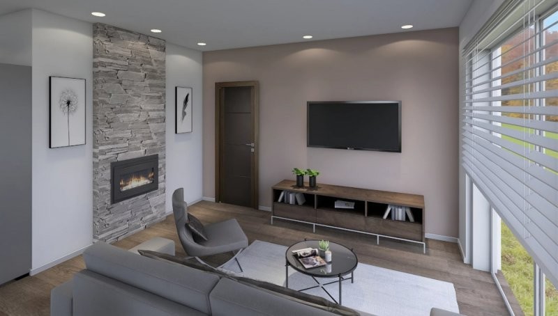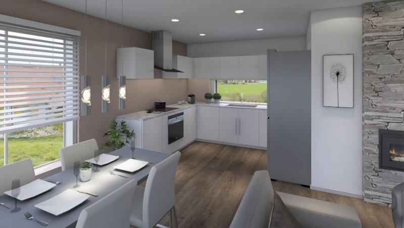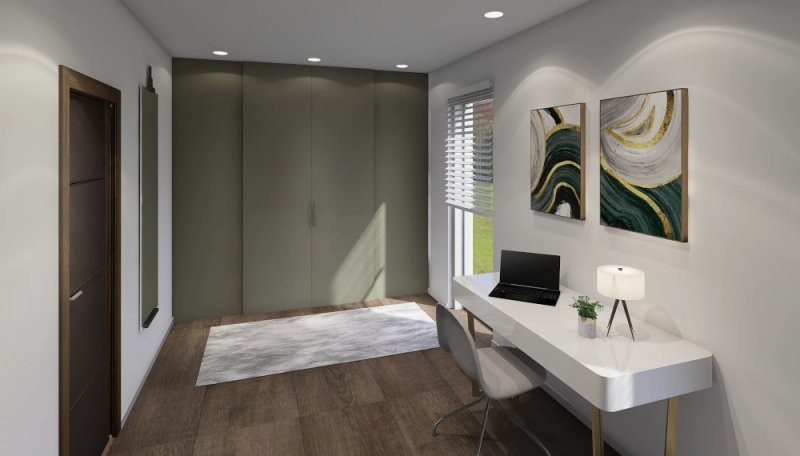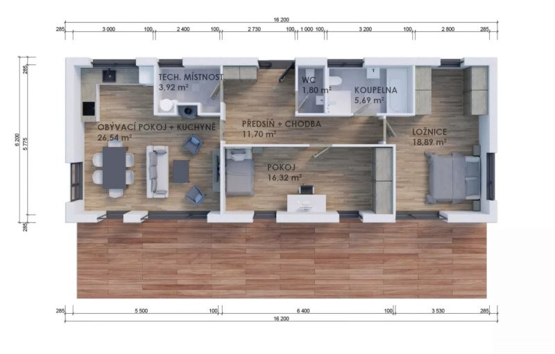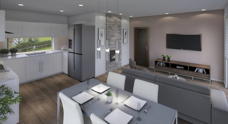 Dispozice: Objekt má jedno nadzemní podlaží s jednou jednotkou 4+kk – vstup se zádveřím a s chodbou, obývací pokoj s kuchyňským koutem, koupelna, wc, technická místnost, 2x pokoj a ložnice.