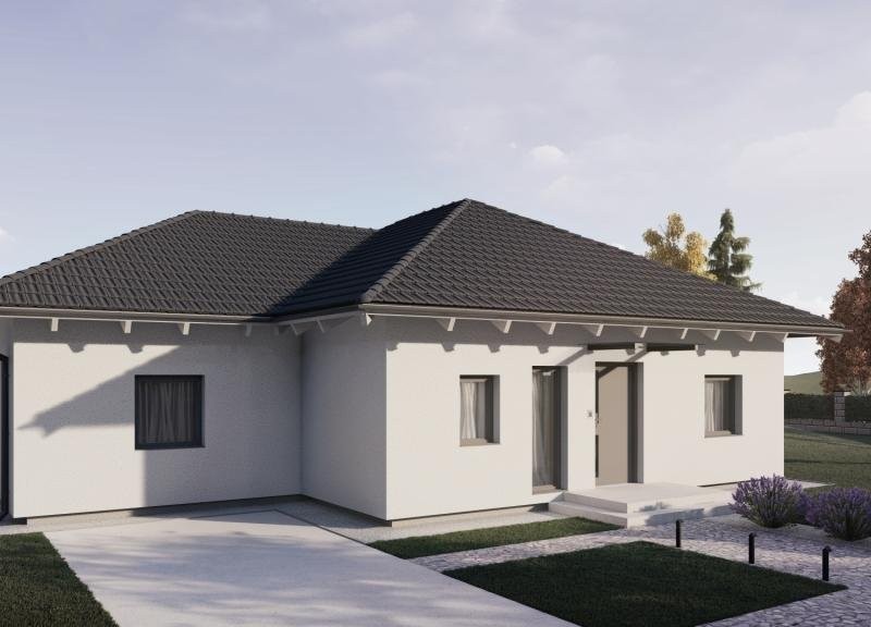 Přízemní dům 125, ve kterém si obývací pokoj „vykročil" trochu více do zahrady a vytvořil tím na jedné straně domu cestu pro zaparkování vozu a na protější straně útulné zákoutí pro terasu. Tímto uspořádáním vznikl téměř 50 m2 velký obývací a jídelní prostor pro rušný život rodiny. Dlouhá chodba, která odděluje koupelnu a technické zázemí od 3 pokojů, je prosvětlena oknem ze zádveří.