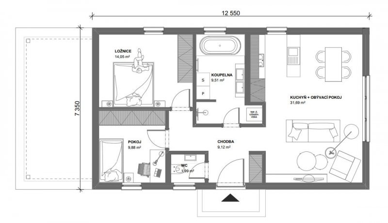 Bungalov s pravidelným půdorysem a garážovým stáním s dispozicí 3 + kk.