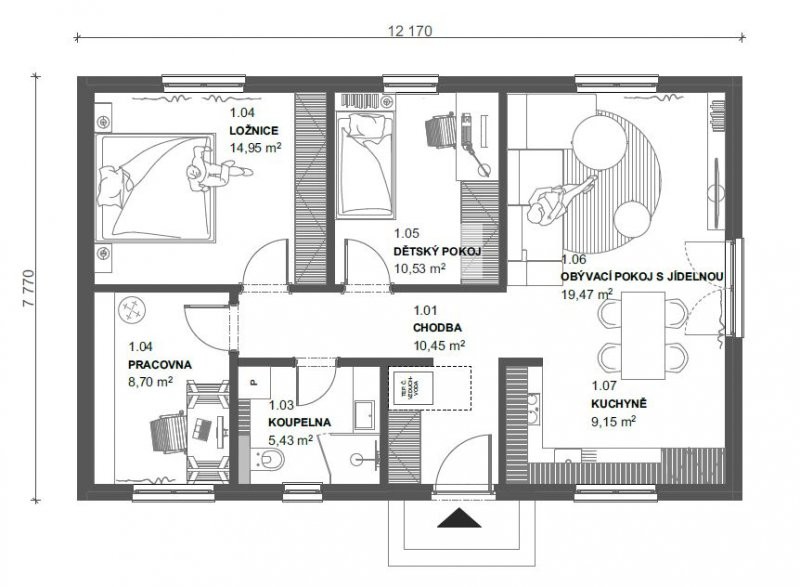 Tři samostatné pokoje, které mohou sloužit jako pracovna, ložnice, dětský nebo hostinský pokoj nabízí dům na pouhých 78 m2 obytné plochy. Prostorná kuchyně na téměř 10 m2 a dvojnásobná velikost připojeného obývacího pokoje vyhoví potřebám větších i menších rodin.