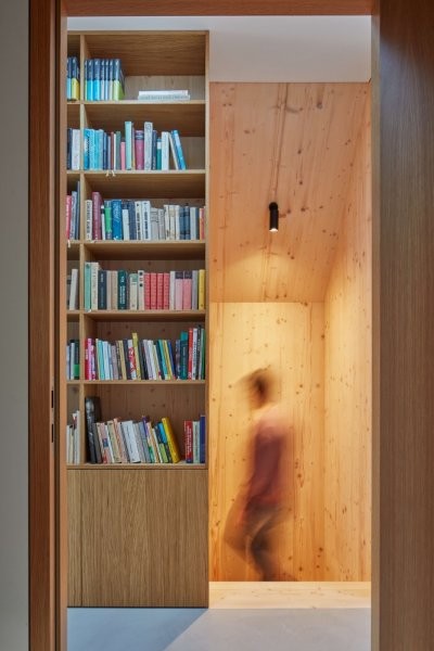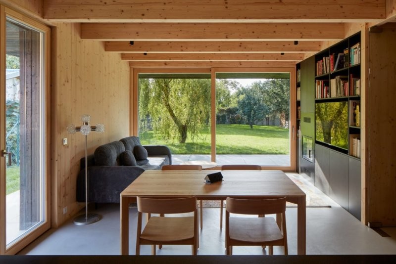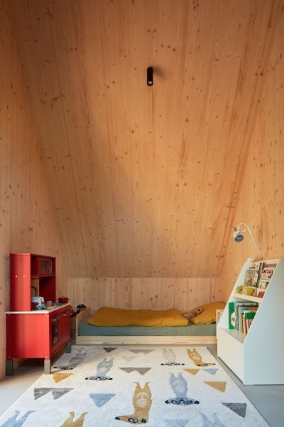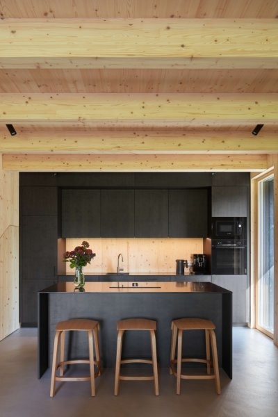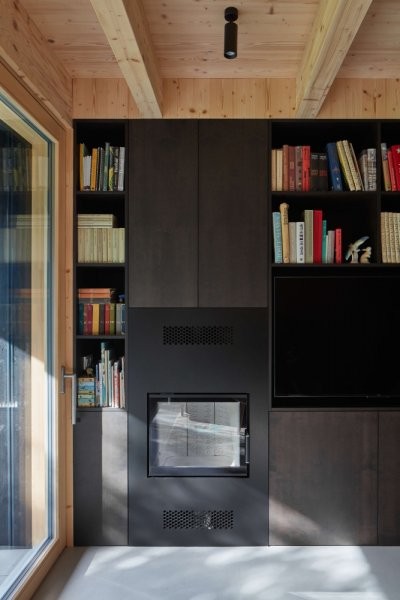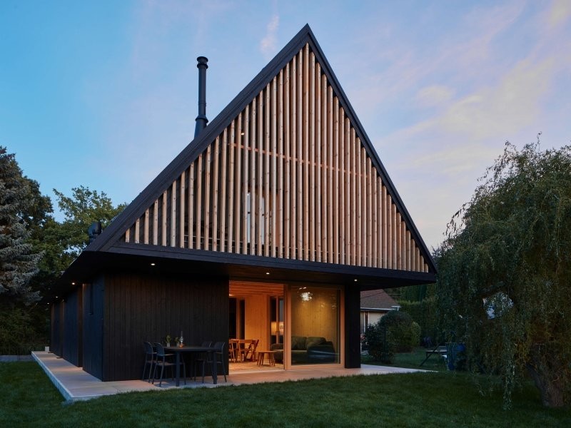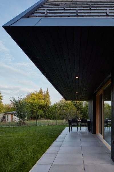 Tvar střechy a její přesahy vychází z typických tvarů chalup, zároveň poskytují stínění jižní fasády a chrání terasu před deštěm. U hlavní ložnice vzniká vykonzolovaný balkon. Materiály jsou nenápadné a přírodní - v exteriéru opálené dřevo, v interiéru pohledové CLT panely, nábytek koresponduje s tmavou fasádou.