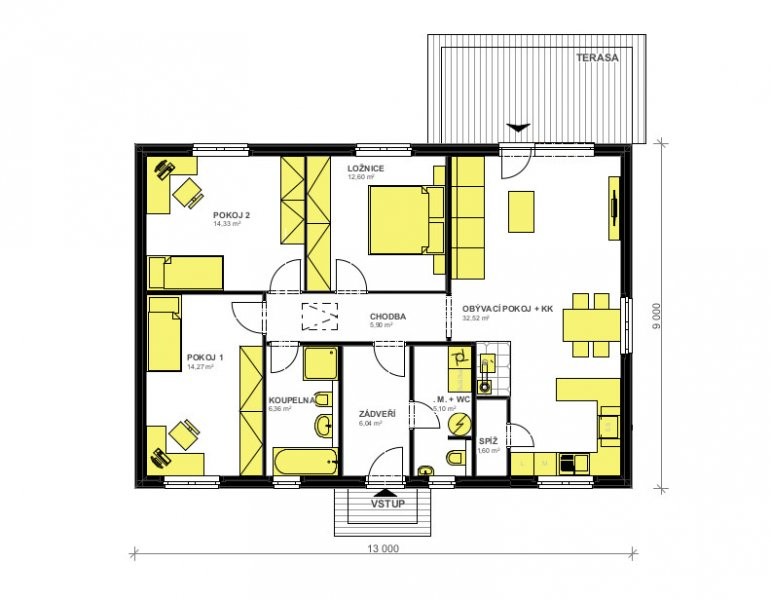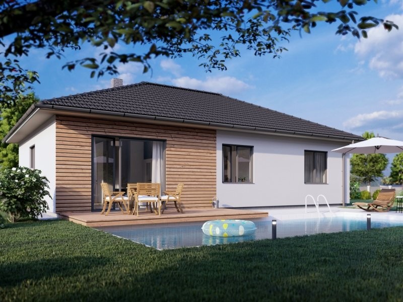 RACIO je dům, který Vám nabídne mnoho úložných prostorů a přiměřeně velké pokoje. Jedna z předností domu, kterou ocení především ženy je spíž do které se vstupuje přímo z kuchyně. Dále pak prostorné zádveří s vestavnou skříní s místem pro botník. Kuchyň je navržena účelově s maximálním využitím prostoru. Pro příjemný pocit „tepla rodinného krbu" jsou v jídelně umístěna krbová kamna, které dodají teplo celé obývací a kuchyňské části domu. Z obývacího pokoje se vstupuje přímo na zahradní dřevěnou terasu. Pokud je dům umístěn na úzkém pozemku, je možné přesunout francouzské okno do jídelního koutu a získat nádherný výhled přímé do zahrady.