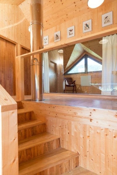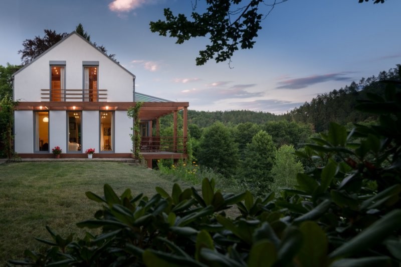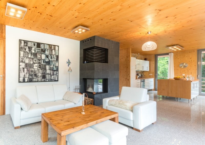 Konstrukční systém: masivní dřevěné panely KLH, stěny i stropy v pohledové kvalitě. Jedinečné řešení trojúhelníkové vikýře v pohledové kvalitě.