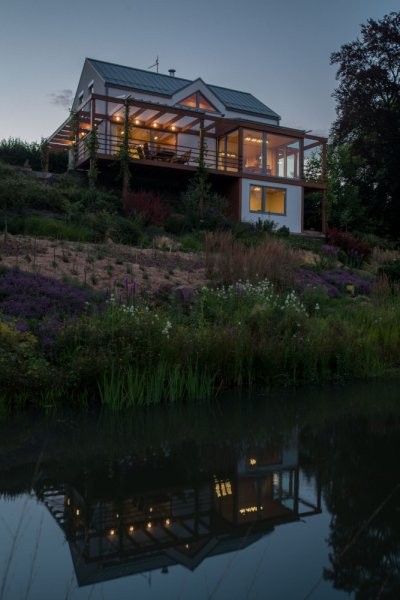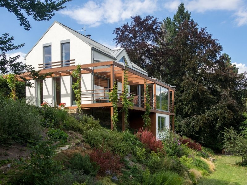 Tento dům s překrásným výhledem na řeku Sázavu je navržen pro bydlení čtyřčlenné rodiny. Založení objektu je zamýšlené na základových konstrukcích po demolici stávajícího objektu. Pro nosnou konstrukci domu jsme zvolili konstrukční systém se stěnami z třívrstvých masivních dřevěných desek. Fasádu pojímáme bílou omítkou a dřevěnými prvky pergoly, připravenými pro vinnou révu. Obytný prostor a prosklená jídelna se otevírají do údolí Sázavy na jižní straně. V horním patře navrhujeme tři pokoje, prostornou koupelnu a pracovnu. Vytápění objektu předpokládáme pomocí elektrických podlahových rohoží s akumulační vrstvou a elektrickými přímotopy, podporované řízeným větráním s rekuperací tepla.