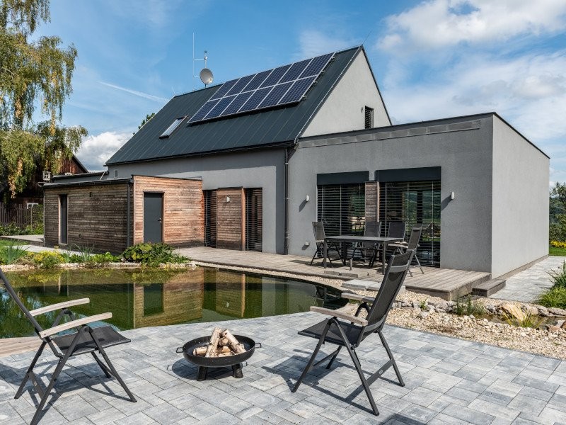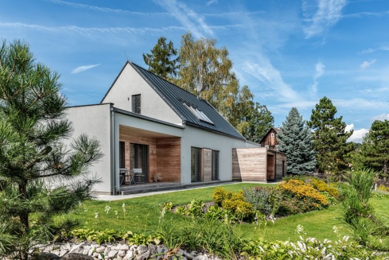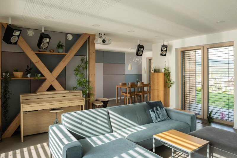 Energeticky úsporné stavební řešení doplňuje ucelený systém technických zařízení, který zajišťuje komfortní a zdravé bydlení s nízkými provozními náklady. Pro provoz domu jsou přednostně využívány obnovitelné zdroje energie (fotovoltaika, tepelné čerpadlo). Komfortní klima a příjemnou atmosféru ve vzdušném a prosvětleném interiéru pomáhají dotvořit masivní dřevěné podlahy, hudební koutek s pianem, profesionální audio sestava, akustický obklad v hlavní obytné části a vnější žaluzie.