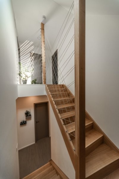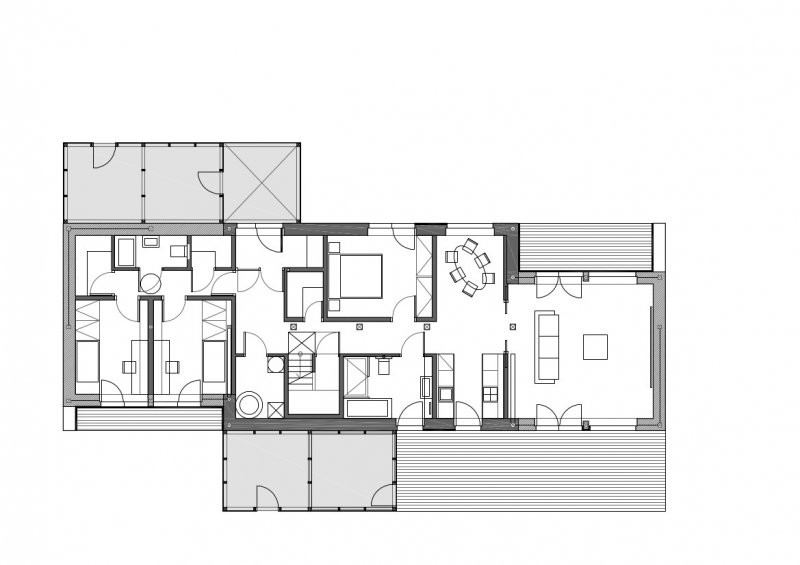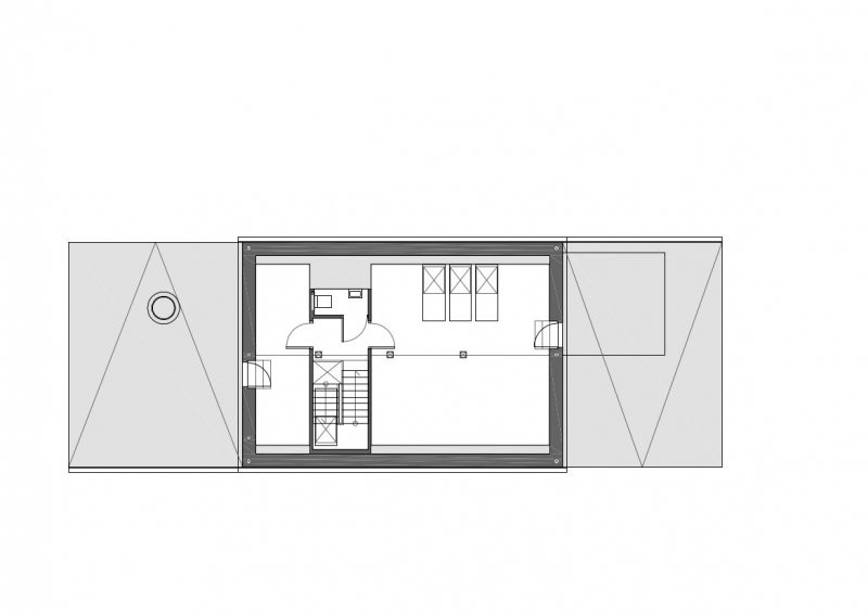 Částečně dvoupodlažní rodinný dům, v podhůří Jizerských hor, pro manželský pár se dvěma menšími dětmi. Dům je umístěn v západní části svažitého pozemku a navazuje na stávající zástavbu. Střední dominantní hmota je zastřešena sedlovou střechou s okny směřujícími na východ s dominantními výhledy na panorama Krkonoš. Na západní straně jsou instalovány fotovoltaické panely. Boční hmoty jsou zastřešeny pultovými střechami s vegetačním souvrstvím, které slouží jako terasy přístupné z podkroví, kde je umístěna pracovna. Hlavní obytnou část tvoří obývací pokoj, kuchyň a jídelna v západním křídle domu. V přízemí je také situována ložnice, koupelna a šatna rodičů. Ve východním křídle jsou umístěny dva dětské pokoje s vlastní koupelnou a šatnou.