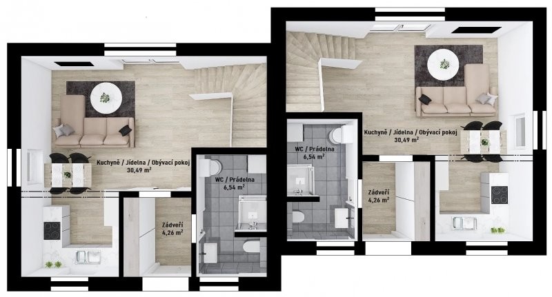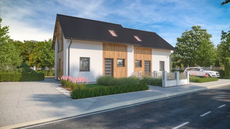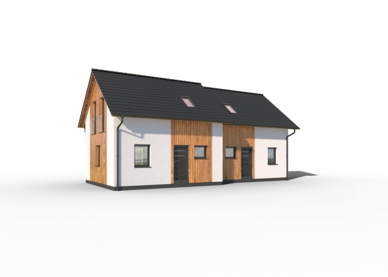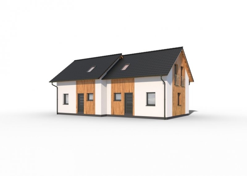 Dvojdům Duo 1-153 skrývá dvě samostatné bytové jednotky, každou s dispozicí 3 + KK. V přízemí je obývací pokoj s kuchyňským koutem a jídelnou doplňen o technickou místnost s koupelnou. V podkroví jsou další 2 pokoje a koupelna.
