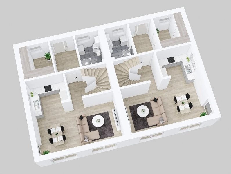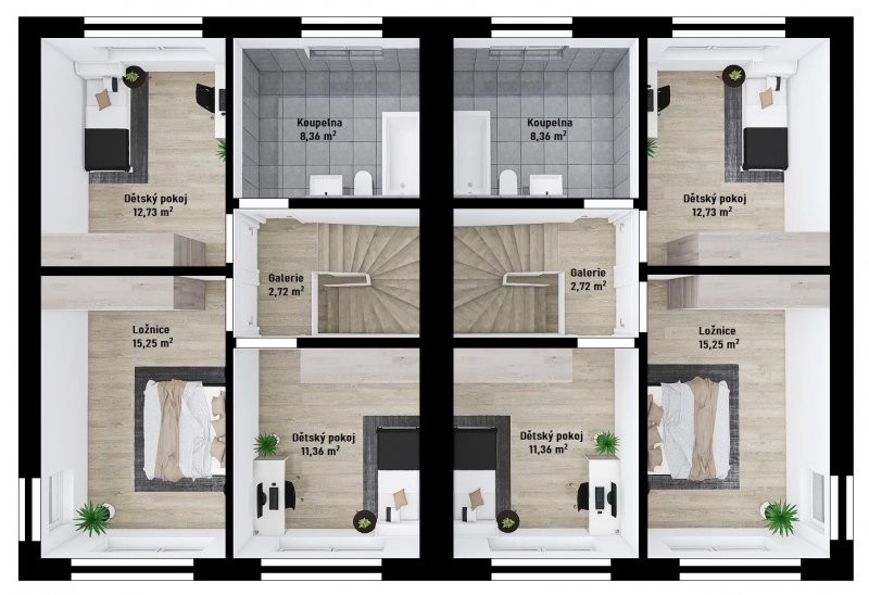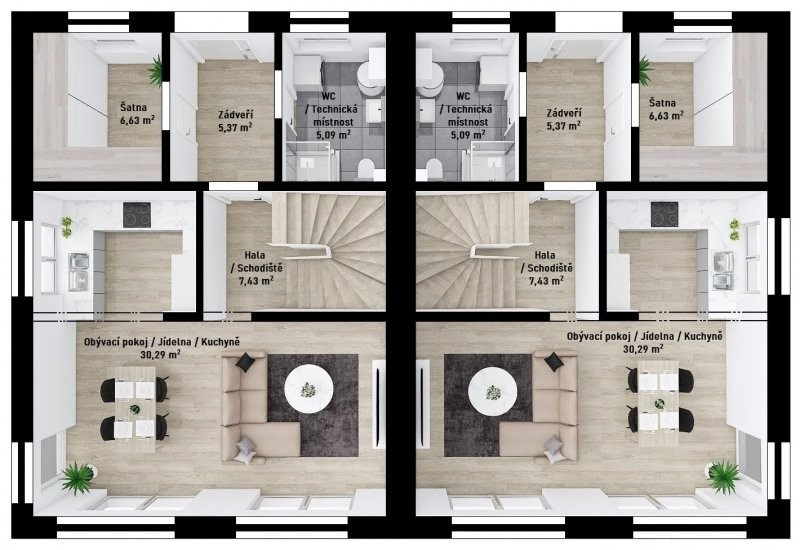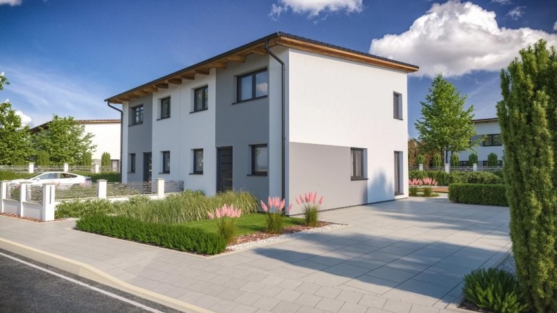 Moderní dvojdům Duo 2-210 byl navržen tak, aby jej bylo možné spojovat do řady. Nemusí tedy zůstat pouze u dvojdomu. Tohoto propojení mohou využít například ti z vás, kteří plánují vícegenerační bydlení. Každou bytovou jednotku tvoří dispozice 4 + KK s šatnou, koupelnou a technickou místností.