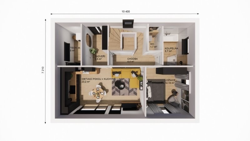 Ve variantě pro rodinu o 4 až 5 osobách se v přízemí nachází velkorysý obývací prostor propojený s kuchyní, koupelna, WC, technická místnost a zádveří. Obývací prostor je řešen prakticky. Velké okno propouští do interiéru dostatek přirozeného světla a vytváří tak příjemné prostředí pro trávení volného času. V části pro kuchyni je dostatek místa. Pokud sníte o velkorysé kuchyňské lince, zde se vám meze nekladou.