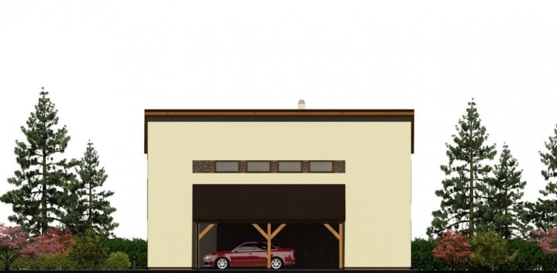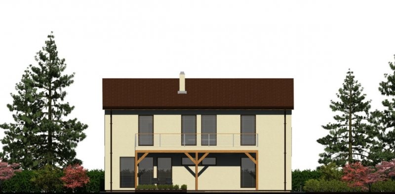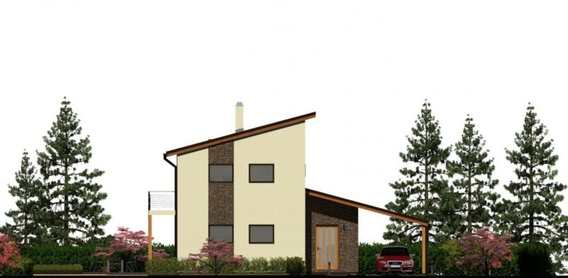 Přesah střechy a balkon na jižní straně přirozeným způsobem zastiňují obytné prostory a chrání je před přehřátím. Vnější povrchy jsou navrženy v dřevěném, svisle orientovaném obložení v kvalitě dle volby zákazníka. Architekturu doplňuje venkovní komín.