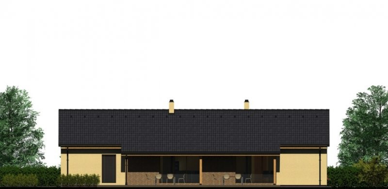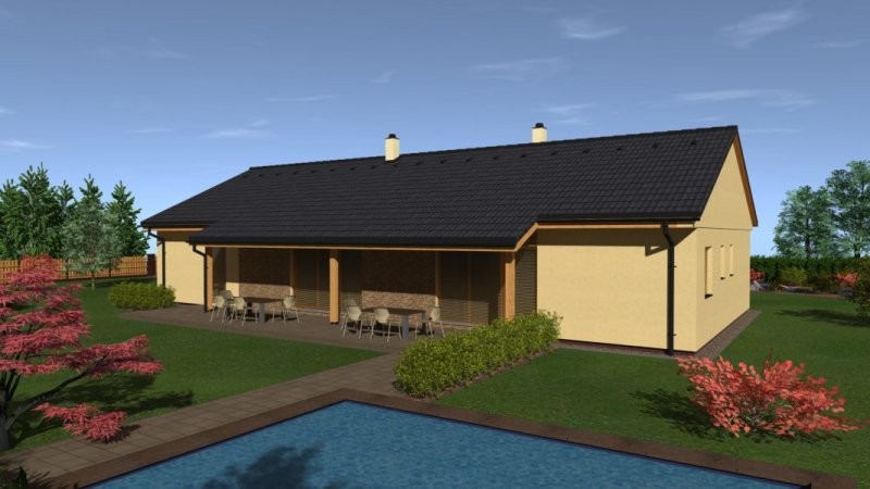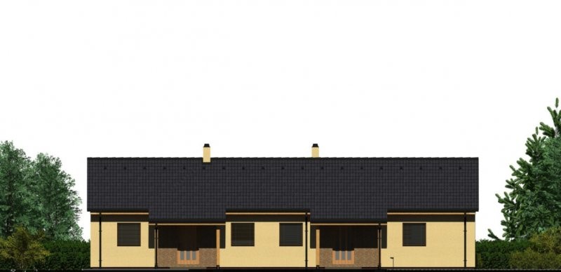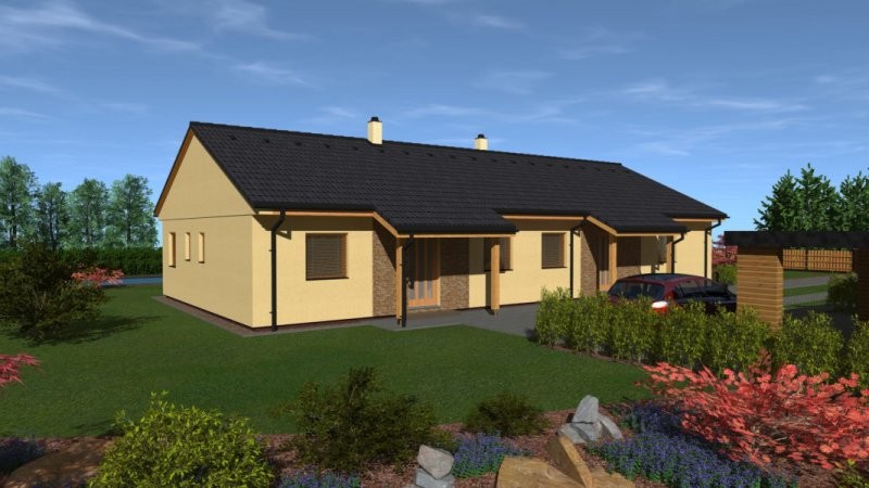 Dům je ideální pro dvě rodiny jedna o 2-3 obyvatelích a druhá 4-5 obyvatelích. Jádrem každého z nich je společný obytný prostor s kuchyní ajídelnou, ústící na jižní straně v krytou venkovní terasu, vstupní partie a zázemí jsou orientovány na sever. Vedle každého vchodu zůstává zpevně ná plocha pro jedno automobilové stání. Na přání zákazníka lze u tento dům doplnit o podkroví u větší bytové jednotky.