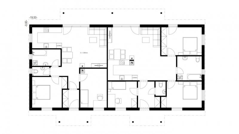 Jedná se o dvougenerační dům se společným technickým zázemím, samozřejmostí je i varianta s oddělenými bytovými jednotkami. Přízemní dům se sedlovou střechou má jednoduchý obdélníkový půdorys, v jehož rámci spolu sousedí dva samostatné byty.