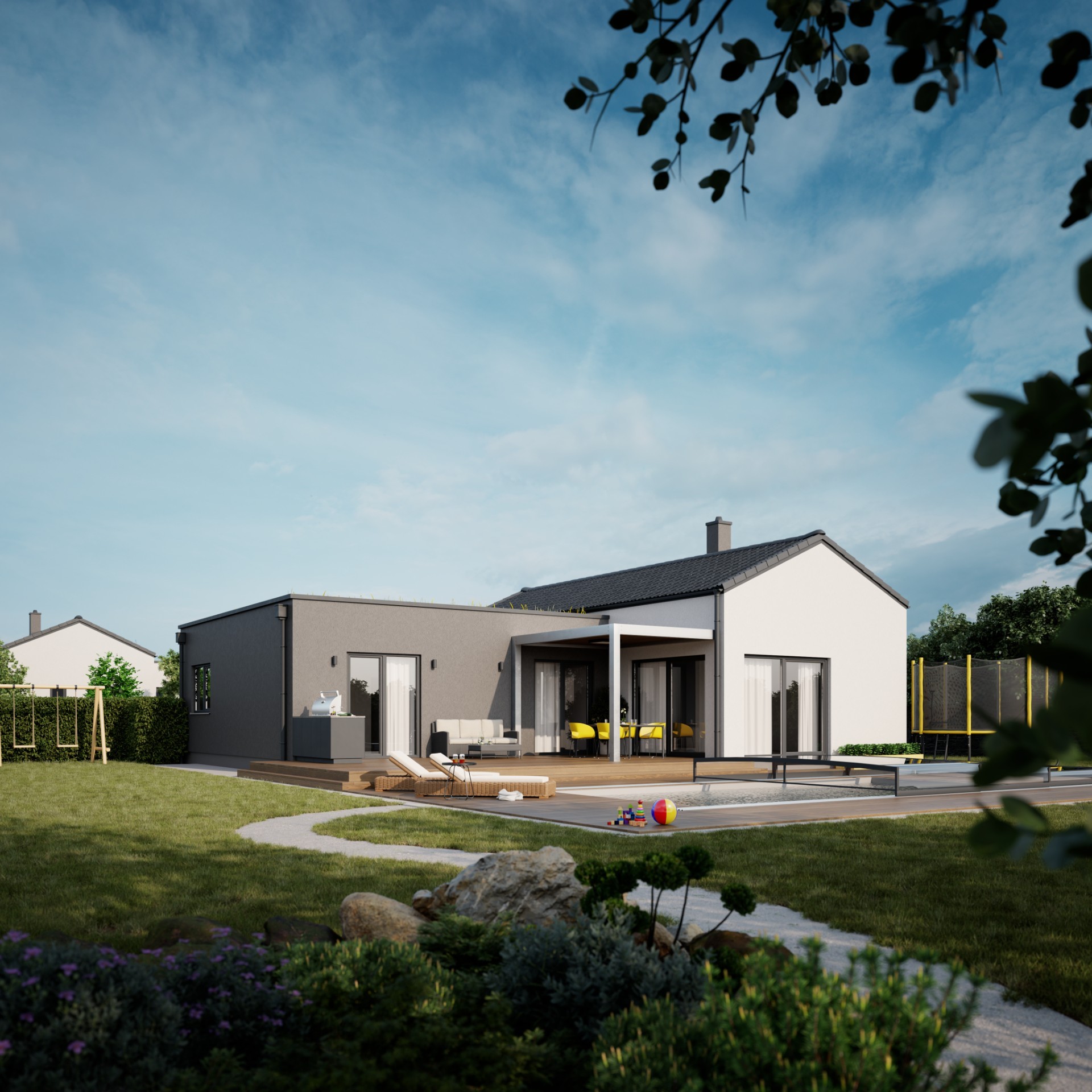 Tento bungalov je ideální volbou pro ty, kdo ocení moderní styl, vzdušnost interiéru a dostatek prostoru jak uvnitř, tak venku. Velkorysé místnosti světlý interiér a různé typy střech dodávají domu výjimečnost.