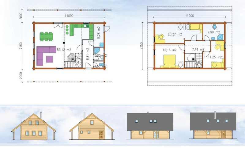 Dřevostavba Faro je přízemní roubený dům s obytným podkrovím je ideální pro 4 člennou rodinu. Roubenka má obdélníkový půdorys tvaru s velkými přesahy střechy na obou bočních stranách. V přízemí dřevostavby se nachází zádveří, technická místnost, obývací pokoj s kuchyňským a jídelním koutem a koupelna s WC. Po schodišti do podkroví se dostaneme do chodby, z níž se vchází do tří samostatných pokojů a také do koupelny s WC.