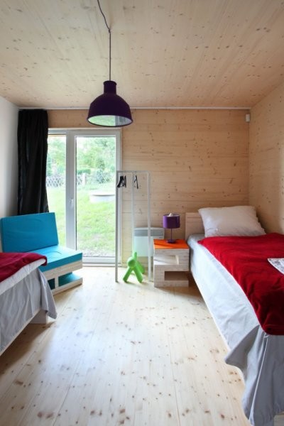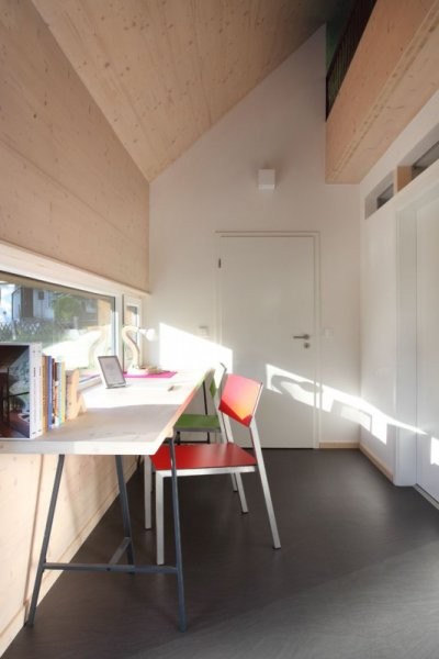 Hlavní obytný prostor přízemí spojuje obývací pokoj s kuchyní a jídelnou. Pokračováním tohoto prostoru je terasa, která prodlužuje dům do zahrady skrz prosklenou stěnu. V druhé části dřevostavby se nachází zázemí a pokoje. V patře je možné realizovat samostatný pokoj, druhou koupelnu, pracovnu, pokoj pro hosty atp.