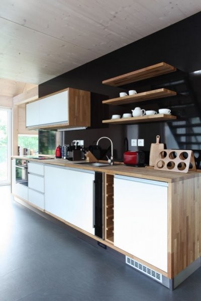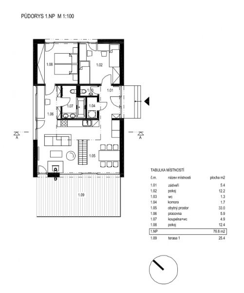 Dřevostavba na klíč je navržena pro 3 – 4 osoby s dispozicí 3+kk a užitnou plochou 76,5m2. Díky platformě II.NP lze užitnou plochu rozšířit až na 108m2 (4+kk). Celý dům je maximálně otevřen a propojen s exteriérem, zároveň však poskytuje potřebné soukromí.